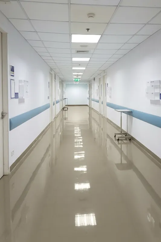 Ein Krankenhaus-Boden muss höchsten hygienischen, chemischen und mechanischen Anforderungen genügen. Die Oberfläche muss leicht zu reinigen und zu desinfizieren sein, darf keine Fugen oder Risse aufweisen und muss beständig gegenüber medizinischen Chemikalien und Desinfektionsmitteln sein. Epoxidharz- und PU-basierte Systeme erfüllen diese Anforderungen zuverlässig und sind daher in medizinischen Einrichtungen weit verbreitet.
