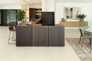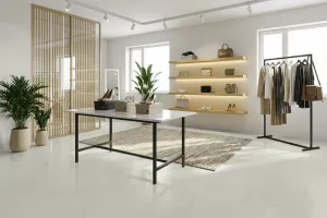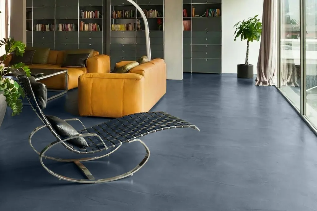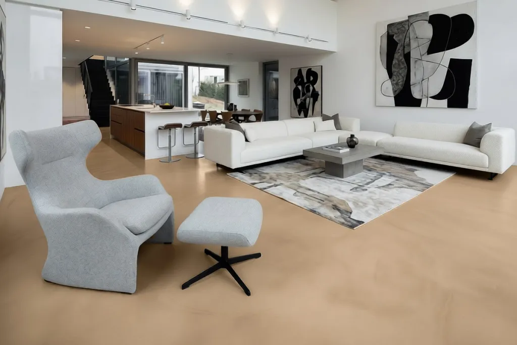 - Unmittelbar nach dem Anmischen das Material auf den Boden gießen und mit einer Flächenrakel gleichmäßig verteilen. Anschließend mit einem Gummiabzieher nacharbeiten, um das Design zu erzeugen.
