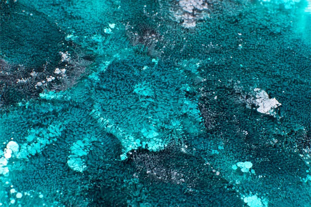 - Tilføj det farvede alcohol ink efter eget valg til blandingen med stadig flydende harpiks-hærder, og tilsæt derefter alkohol ink i SELENIT WHITE. Blækkerne reagerer med hinanden og skaber et unikt mønster. Jo flere hvide blækdråber du tilføjer til den farvede blækdråbe, jo mere udtalt og dybere bliver effekten.
